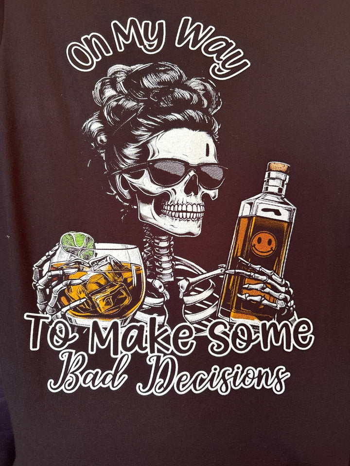 Ladies cut District DT6002 black shirt with multicolored image. "On My Way To Make Some Bad Decisions" on the back. Small version in white on front left chest.