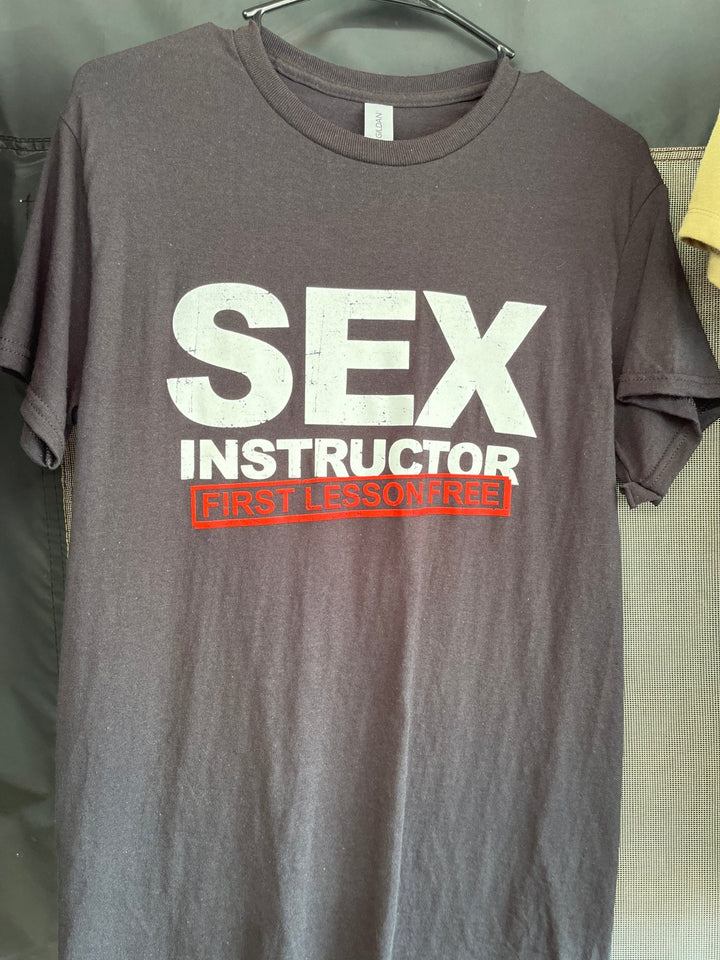 Black Gildan 5000 T-shirt with red and white print "Sex Instructor First Lesson Free" on the front.