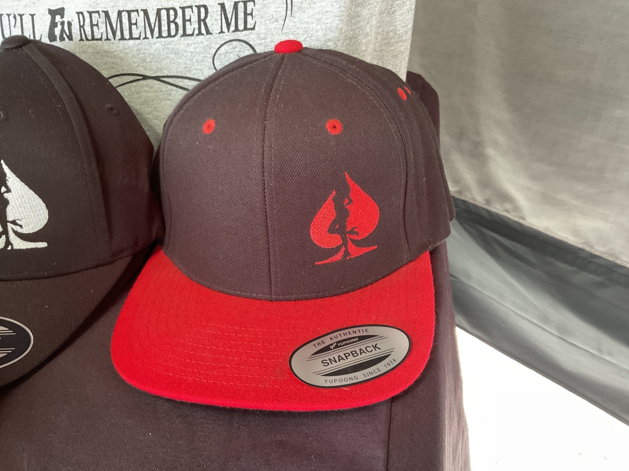 Embroidered 1 color “Sexy Spade” logo on the left front of a SnapBack hat.